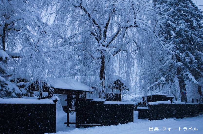 茅葺屋根に積もる雪。