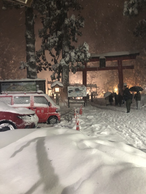 この先は真っ暗だ。聞こえるのは暗闇に消える雪の音だけ。山門をくぐると下に降りる石段があるが、石段がほぼわからずすべて新雪。数十メートル降りて、二人は顔を見合わせる。