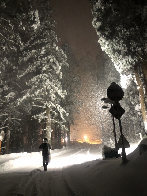 携帯グーグルマップを片手に黙々と進む。街灯もまばらな真っ暗な雪道。降り続く雪の中、途中靴裏にへばりつく雪をたたき落としながら歩き続けた。アイゼンが大正解。しっかり道をつかむ。が、しんどい。さすがにしんどい。